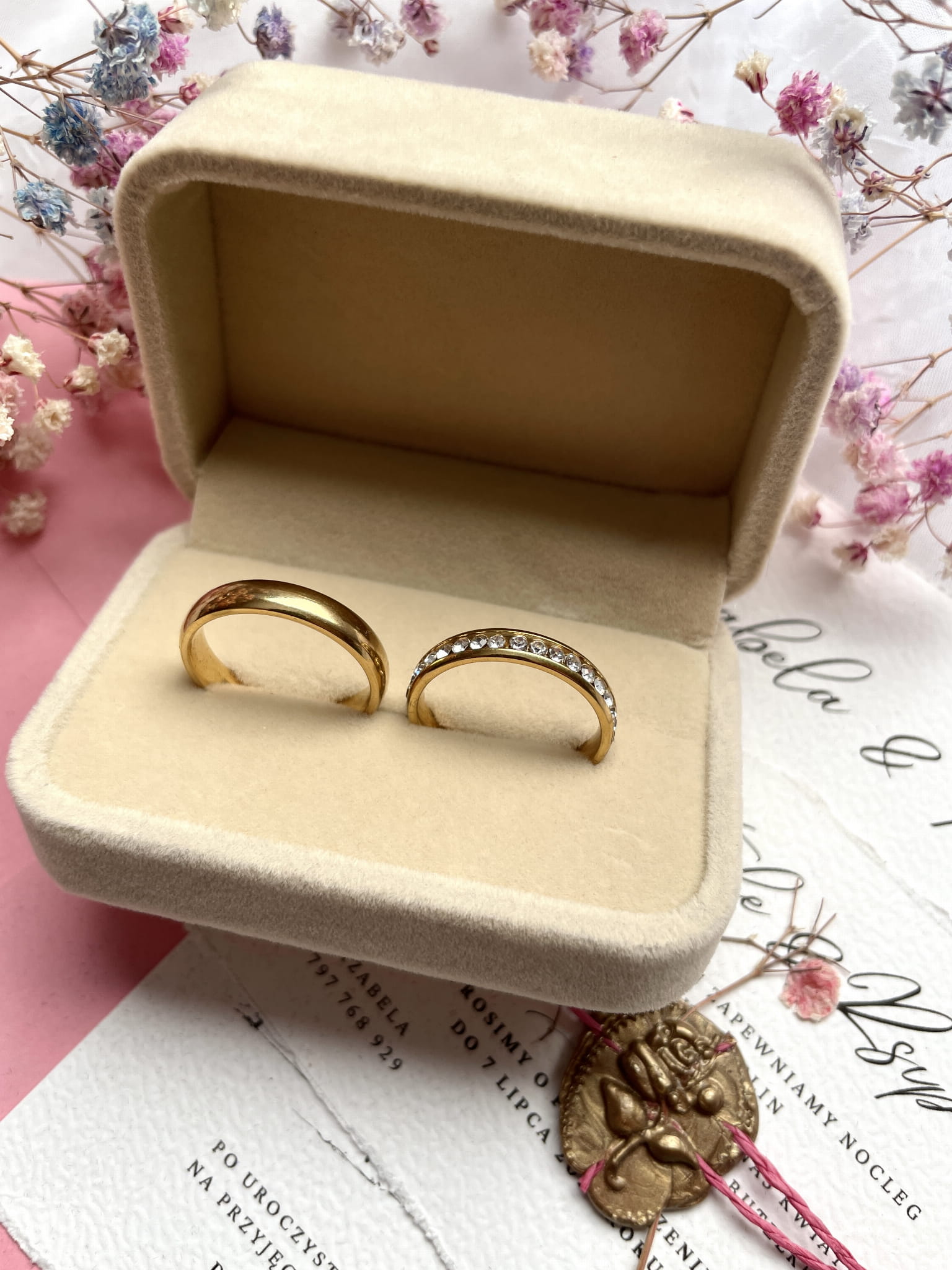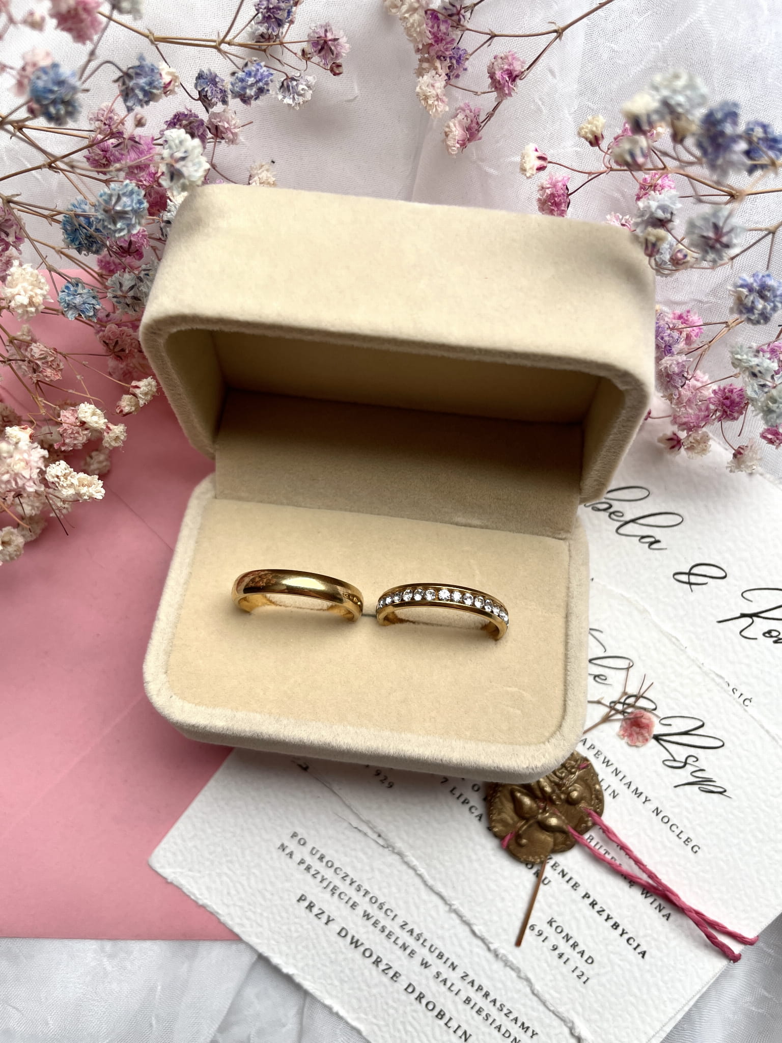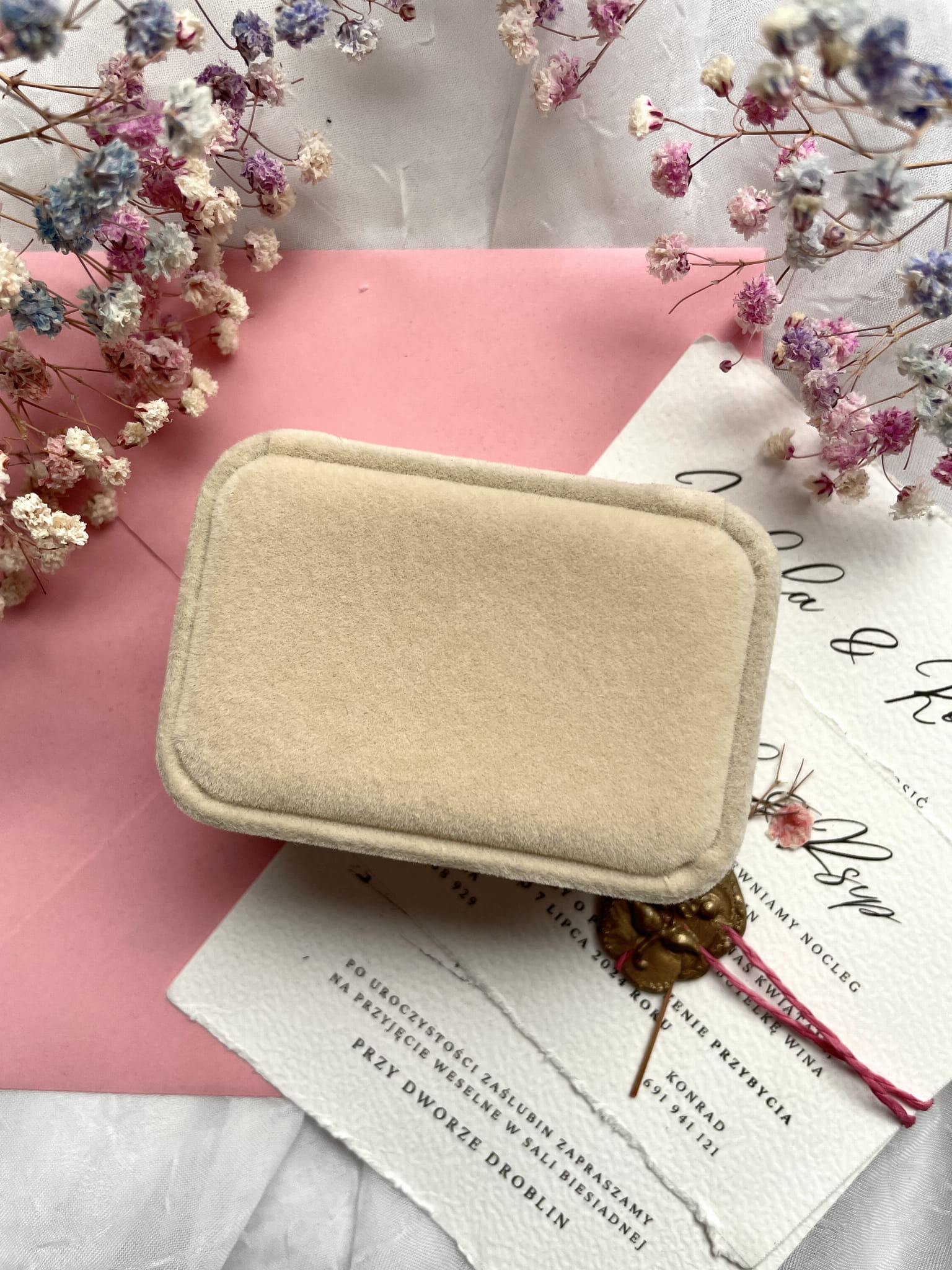 Zamszowe pudełko na obrączki.