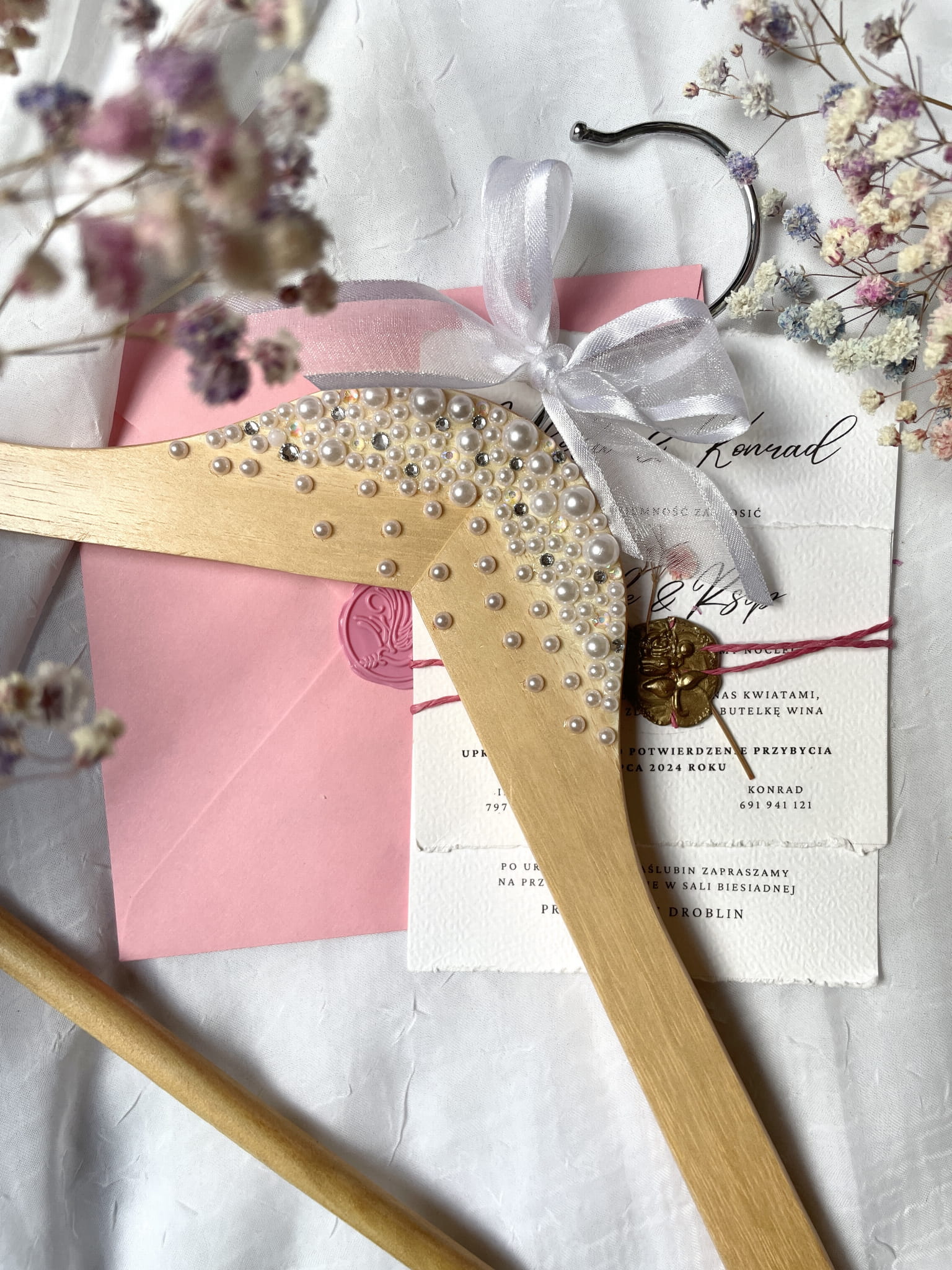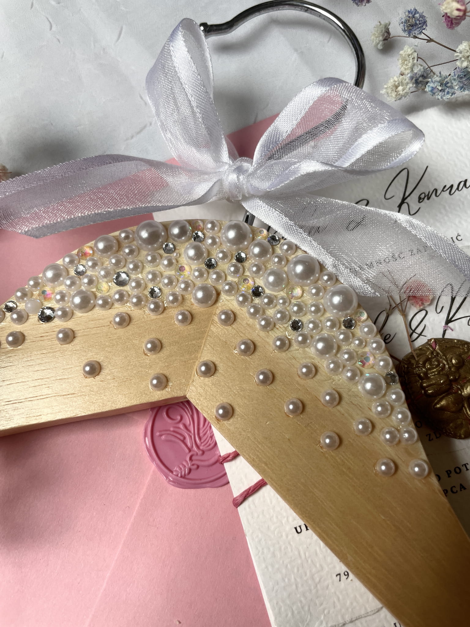 Drewniany wieszak z kokardką, zdobiony perłami i cyrkoniami.