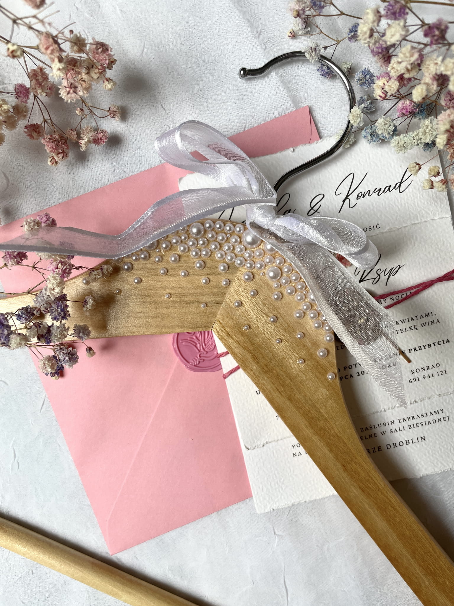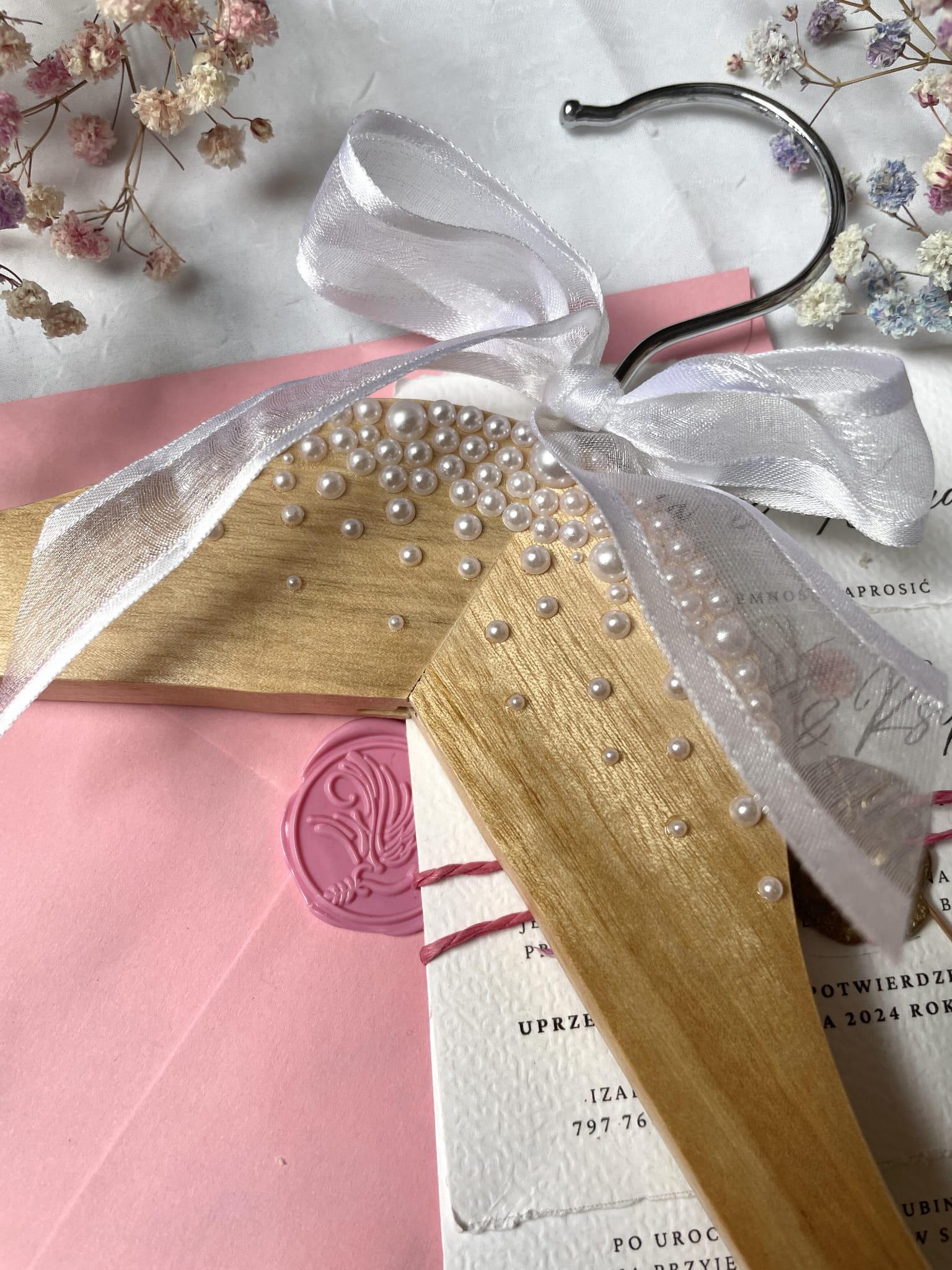 Drewniany wieszak z białą kokardką, zdobiony perełkami.