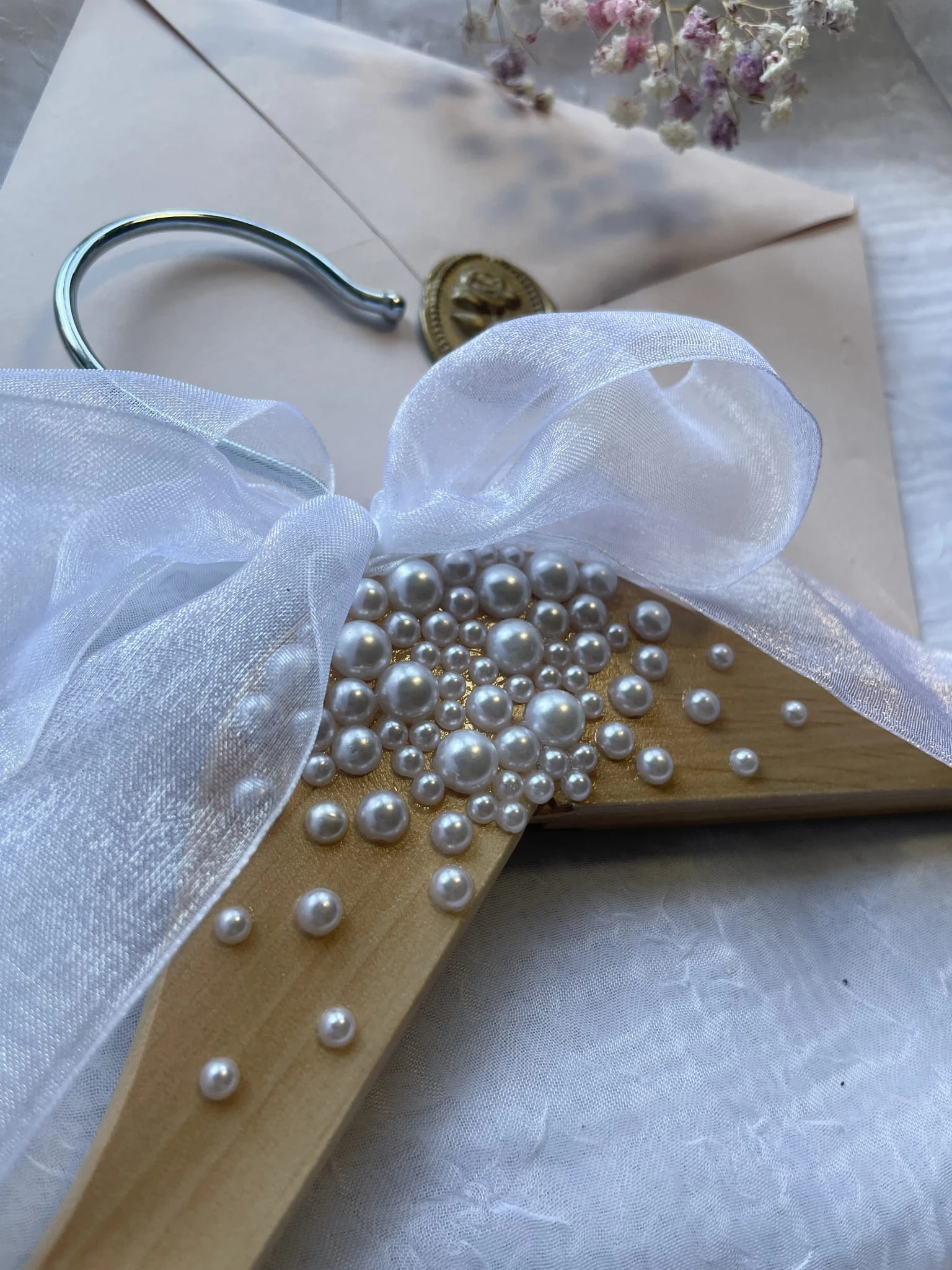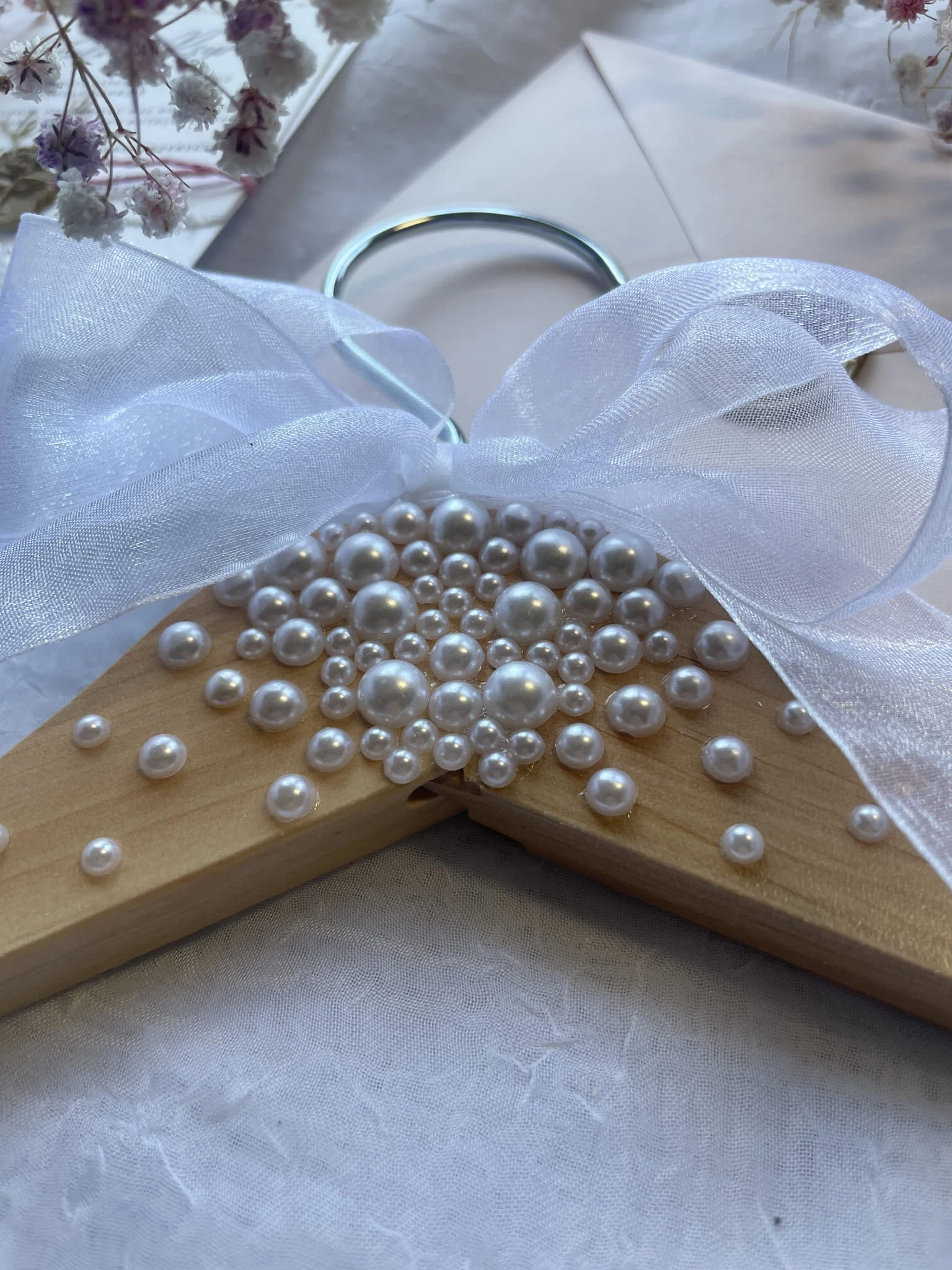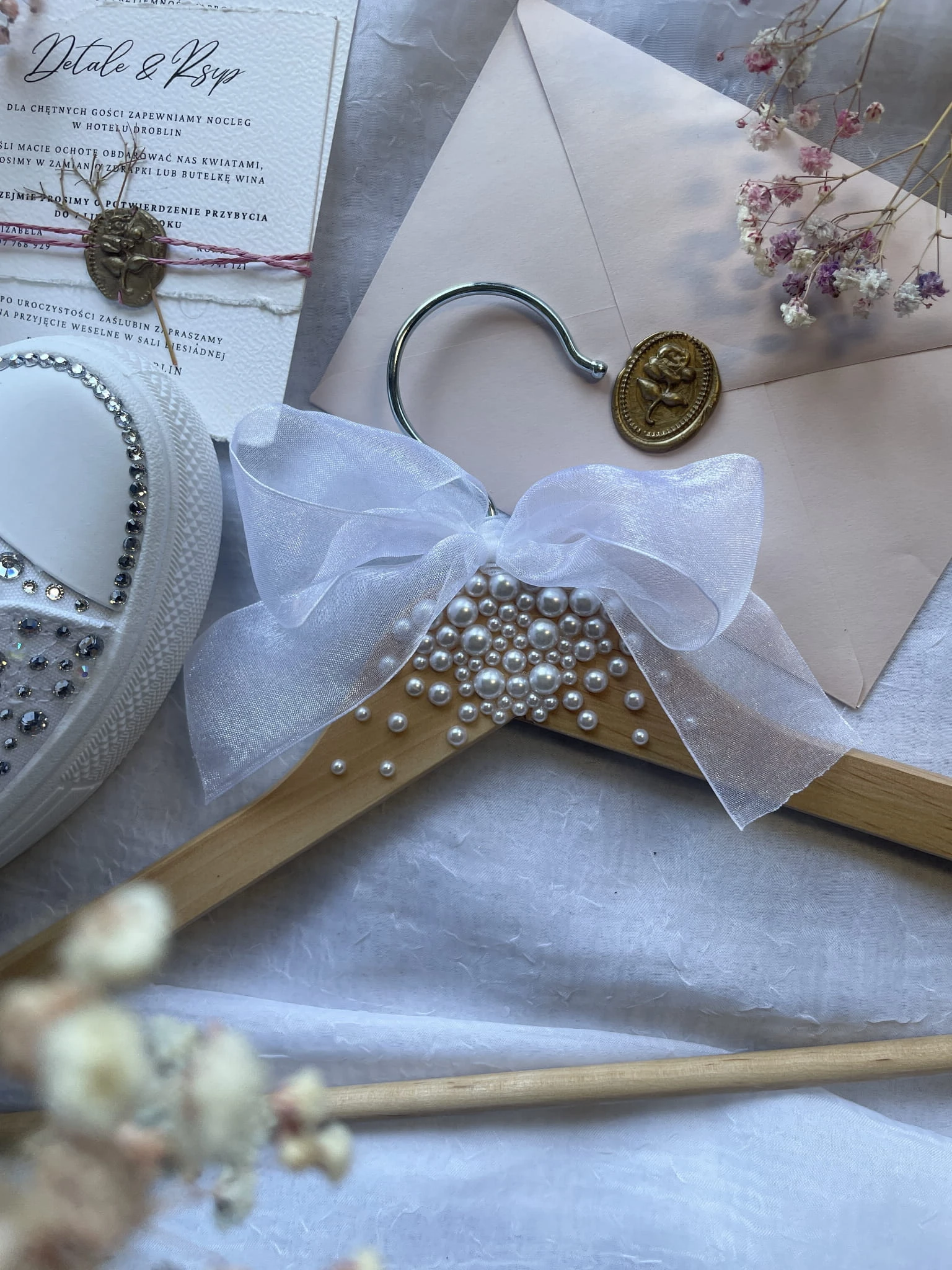 Perły oraz biała kokardka.